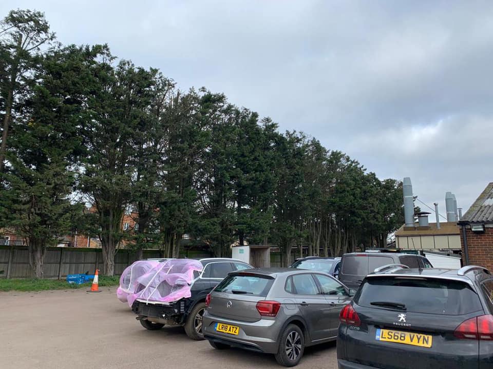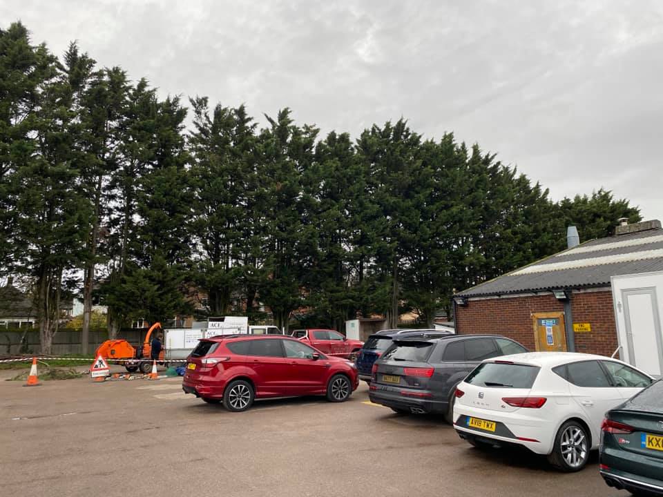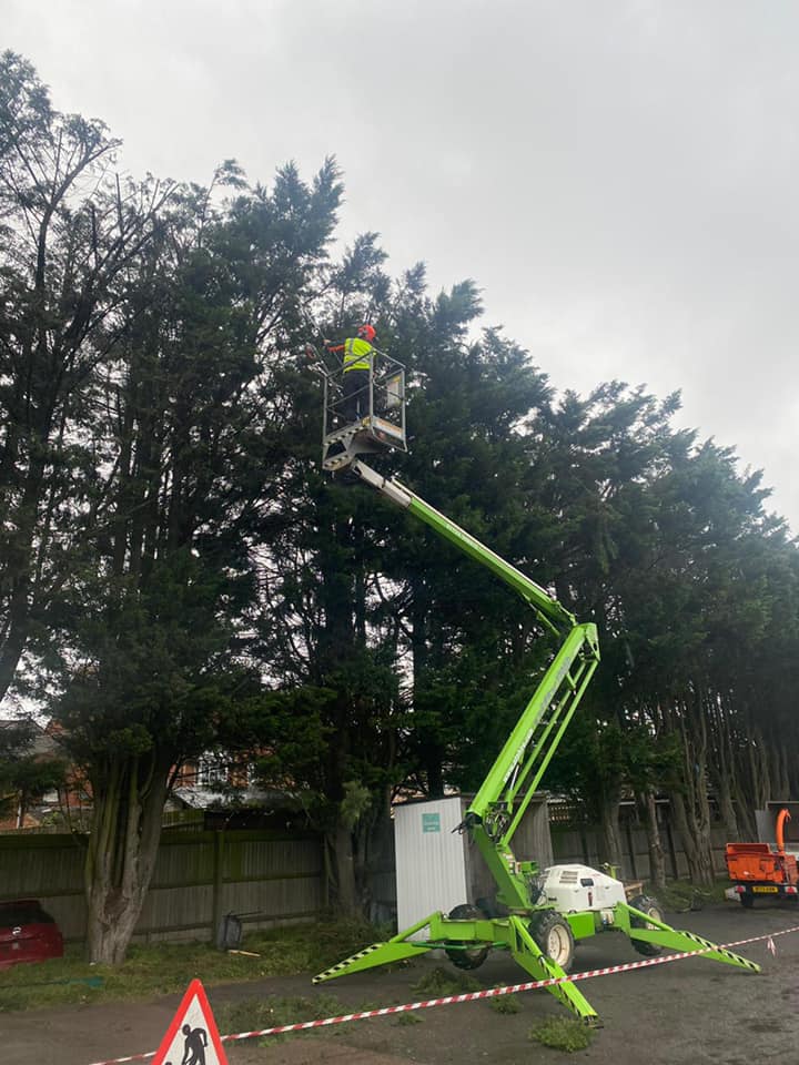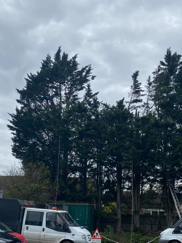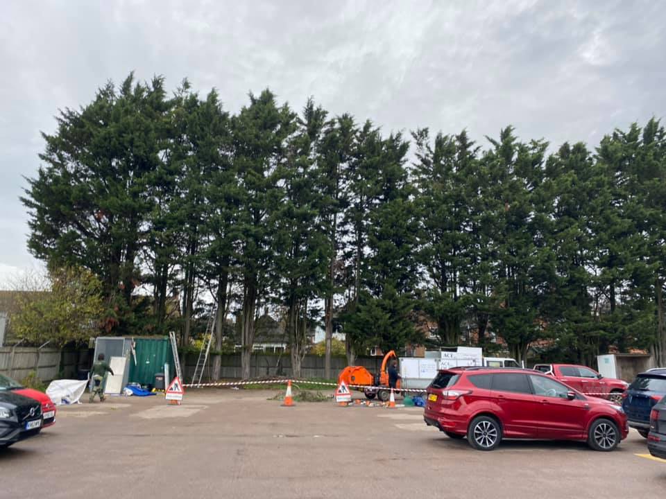 Reduction and trimming of a very large conifer hedge at a commercial premises.