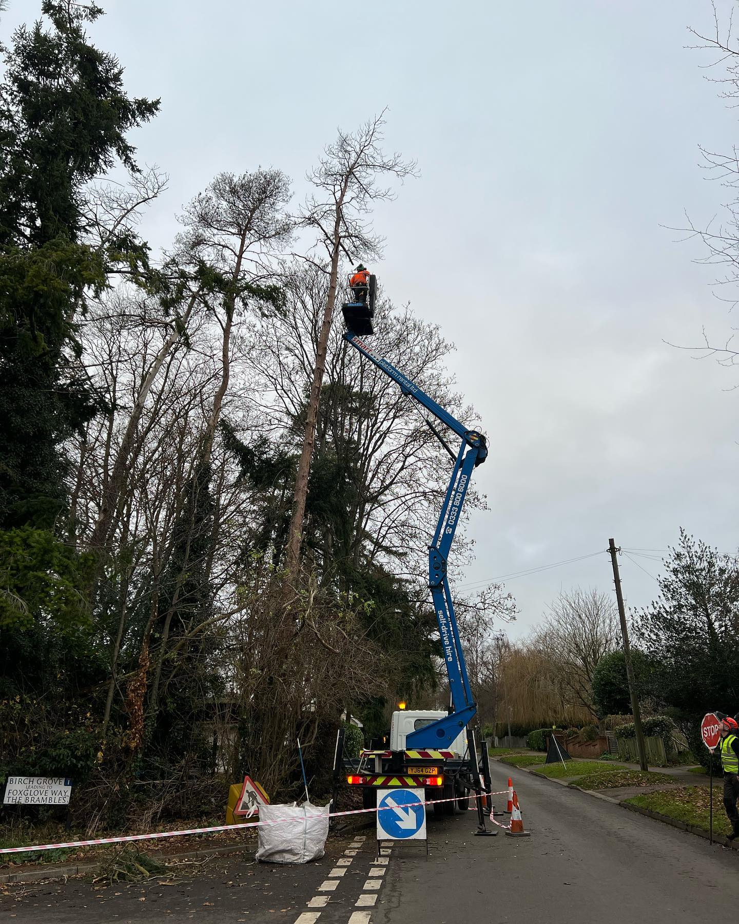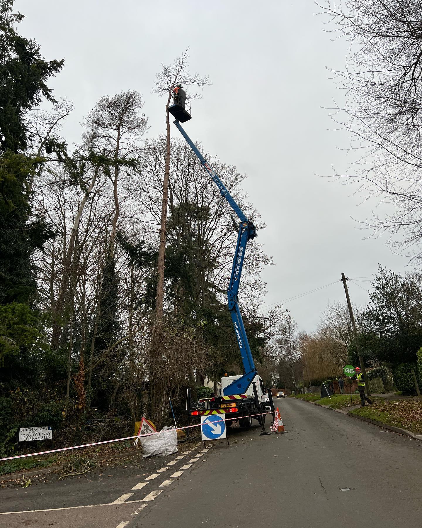 Removing dead trees using a mobile elevated work platform.